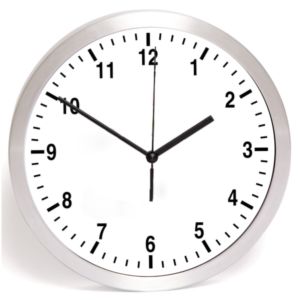 10" round aluminum wall clock with shatter resistant acrylic lens.