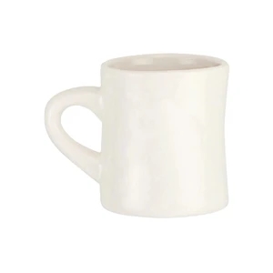 11 oz. white ceramic diner mug with thick curved handle and glossy exterior.