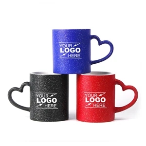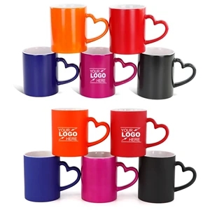 3 2/8" x 3 2/8" x 3 6/8" ceramic 11 ounce heat-activated color changing mug with heart-shaped handle.