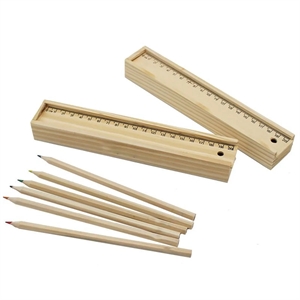 Set of 12 wood colored pencils and sharpener in wooden gift box with sliding ruler cover.