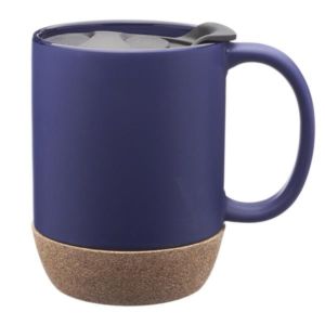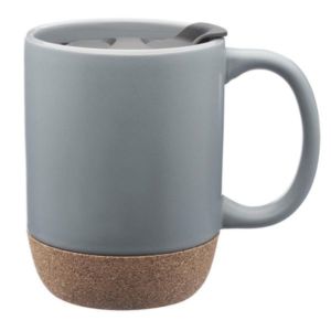 13 oz. ceramic mug with faux cork bottom, glossy finish interior, matte exterior and plastic push-on removable lid.