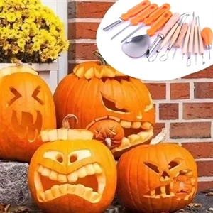 14 piece pumpkin carving kit with plastic and wooden handled steel tools in 10" x 8.375" x 1.5" storage case.