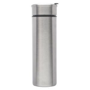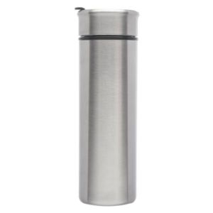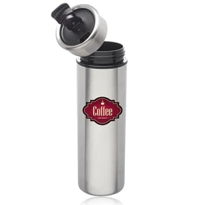 14 oz. stainless steel travel mug with plastic black interior, spill-proof/twist-turn lid with flip and black top seal.