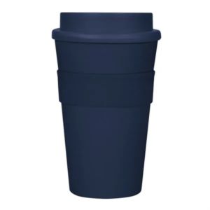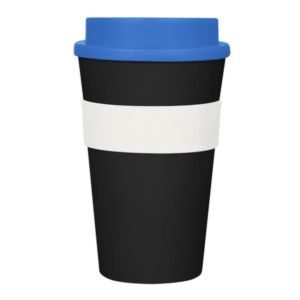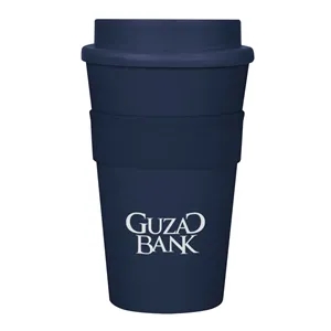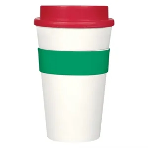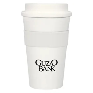 16 oz. travel tumbler with a silicone grip and a screw-on, spill-resistant, sip-through lid.