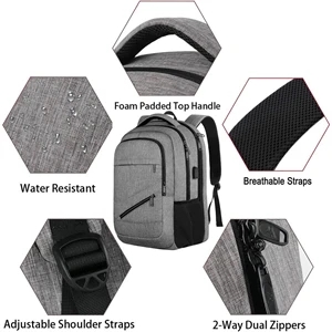 14" x 19" x 7.8" Oxford fabric backpack for 17" laptop with multiple compartment, USB port, luggage belt and shoulder straps.
