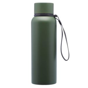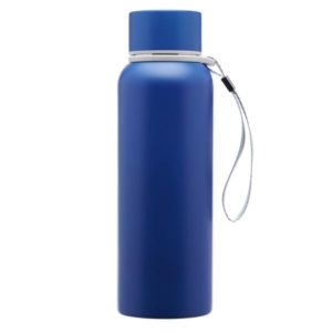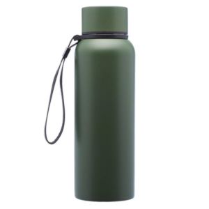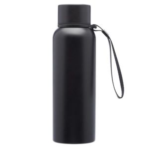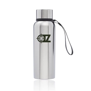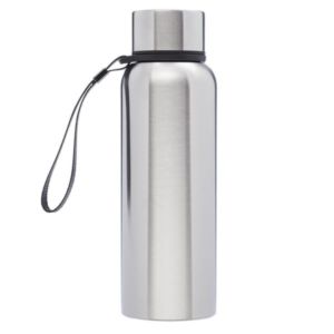 17 oz. stainless steel water bottle with double wall vacuum insulation, plastic lid with stainless steel wrap and carry strap.