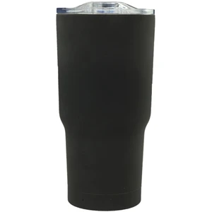 17 oz. rubberized stainless steel travel tumbler with double wall vacuum insulation and a clear plastic lid.