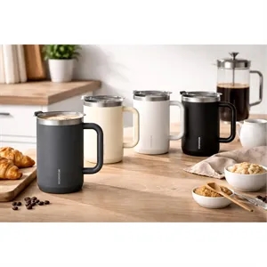18 oz. double-wall insulated stainless steel travel mug with sliding lid and handle.