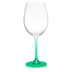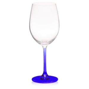 19 oz. 100% Lead free crystal wine glass; with custom colored stem and base.