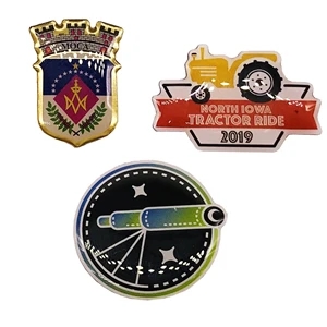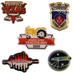 Offset full color lapel pins that can be customized in size, shape and color; FLAT Shipping Charges apply.