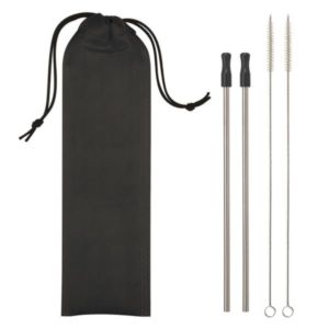 11" x 3 1/8" kit containing two stainless steel straws with two silicone tips and two wire cleaning brushes in a travel pouch.