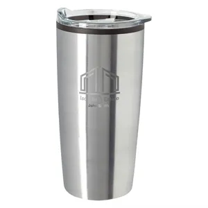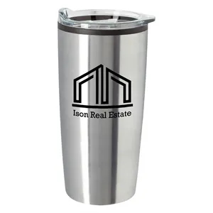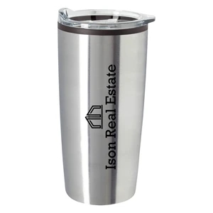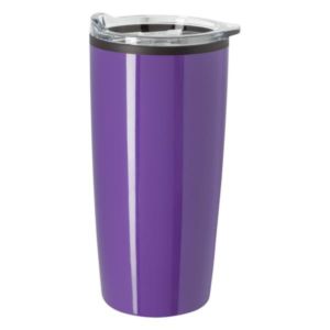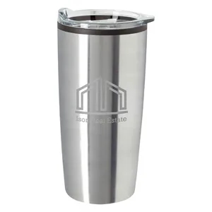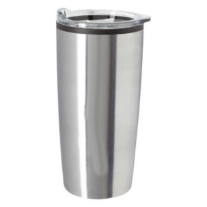 20 oz. tumbler made of stainless steel with a plastic inner liner and non-slip bottom.
