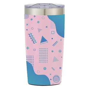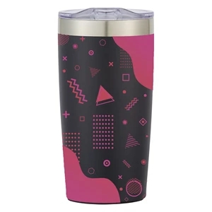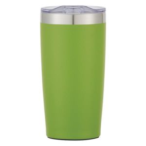 20 oz. double wall insulated stainless steel tumbler with snap-on, spill-resistant thumb slide lid; 18 oz. with lid on.