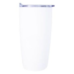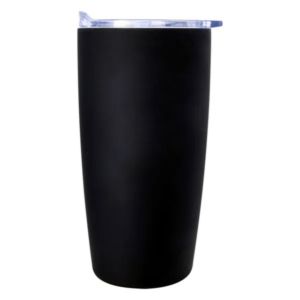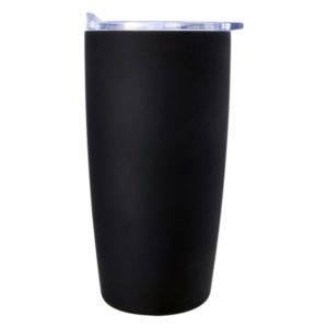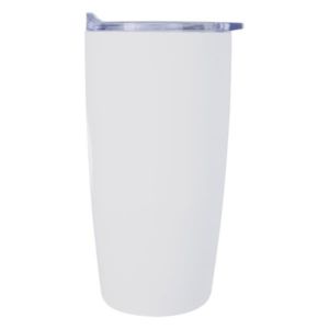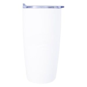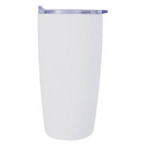 20 oz. double wall stainless steel tumbler with a snap-on, spill-resistant, thumb-slide lid, rubber gasket and a non-slip bottom.