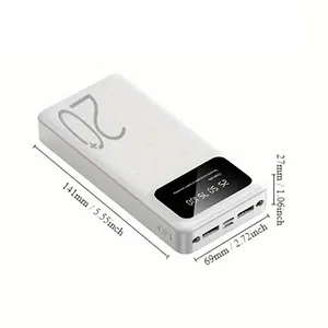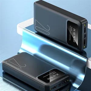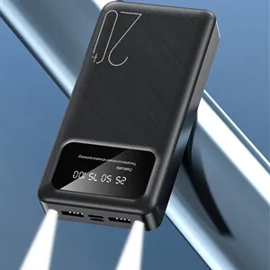 Portable 20000mAh power bank with hidden cable, LED display, flashlight, foldable stand, airline-approved design and multi-device