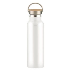 21 ounce double wall insulated stainless steel bottle with wide mouth opening and screw on bamboo wood lid.