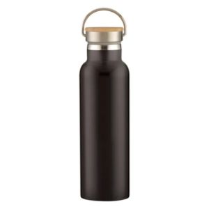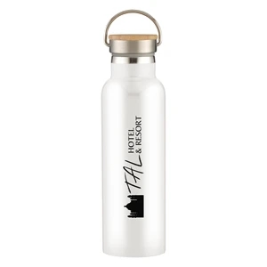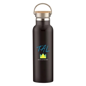 21 oz. stainless steel, double-wall, vacuum insulated bottle with a carry handle and a wood lid.