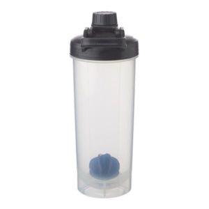 24 oz. plastic shaker bottle with mixing ball and handle.