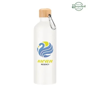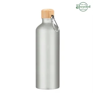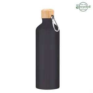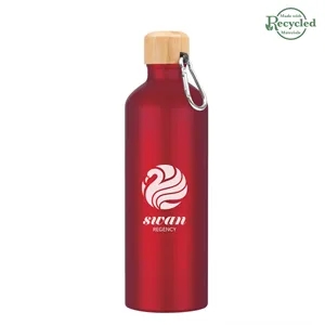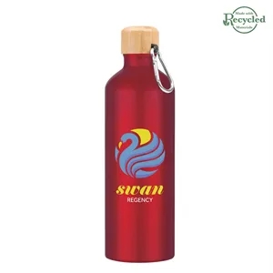 Aluminum 25 ounce bike bottle with screw-on bamboo lid and metal carabine clip.