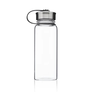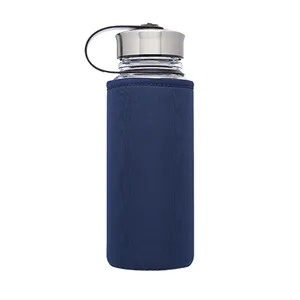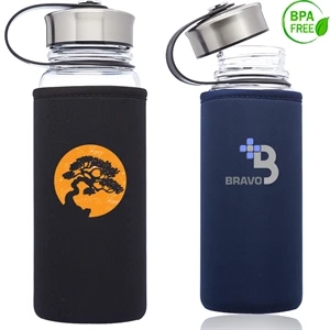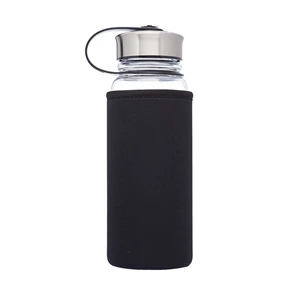 25 oz. glass sports bottle in a neoprene pouch; features a screw-on, black plastic lid and plastic handle.