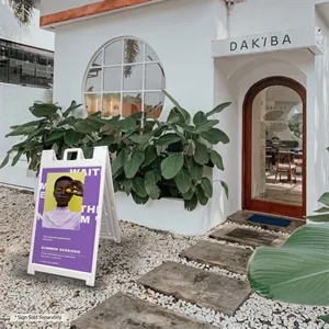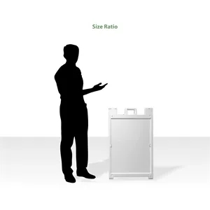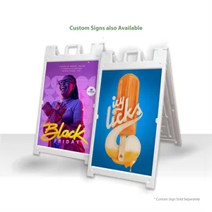 Durable 24" x 36" plastic A-frame with handle, stay tabs, hinge locks, and sand-fill holes.