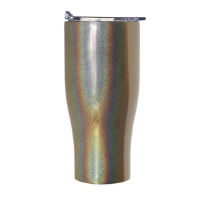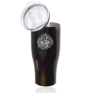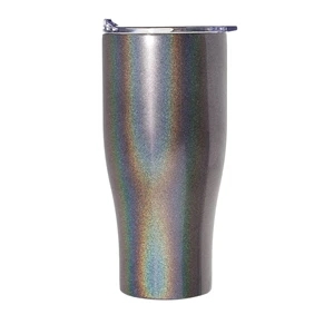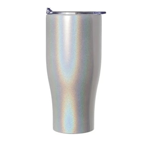 27 oz. iridescent stainless steel travel mug with vacuum insulation and clear push lid.