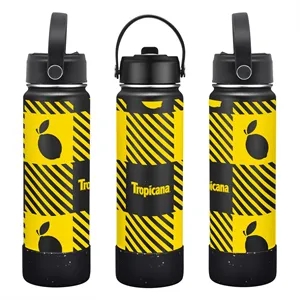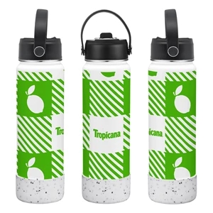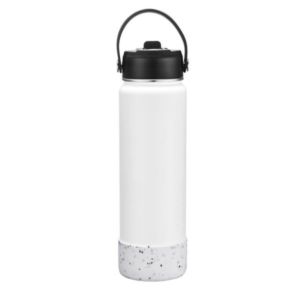 27 oz. powder coated stainless steel bottle with double wall vacuum insulation, large mouth opening and leak-proof lid.