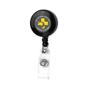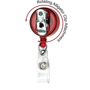 1 1/4" x 1 1/4" plastic round badge with rotating metal alligator clip on 30" retractable reel.