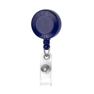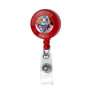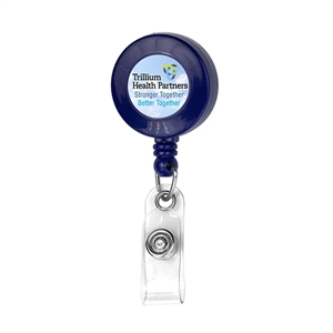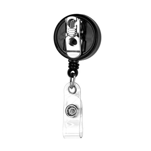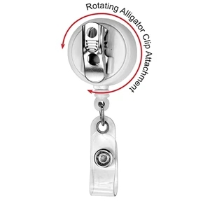 1 1/4" x 1 1/4" plastic square badge with rotating metal alligator clip on 30" retractable reel.
