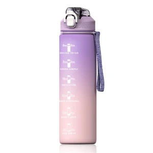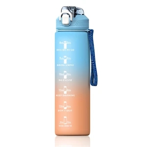 32 ounce plastic water bottle with time markers, silicone straw, pushbutton flip top lid and wrist strap.