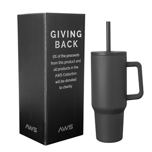40-ounce tumbler with a handle, double-wall construction, screw-on lid, straw hole and straw.