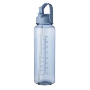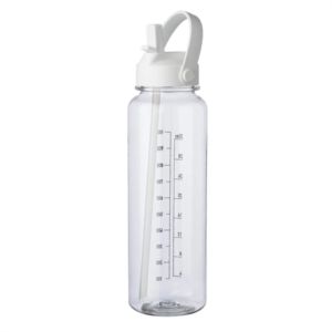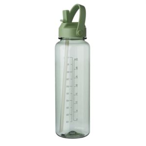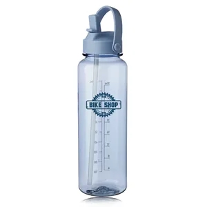 40 oz. capacity plastic water bottle with screw on plastic lid, straw, and measurements.