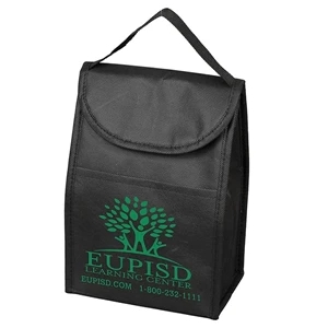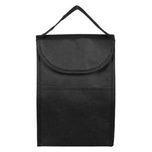 8 1/2" x 7" x 10" 80GSM non-woven polypropylene cooler bag with insulated reflective lining, pocket and hook and loop closure.