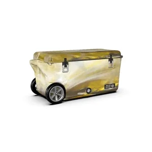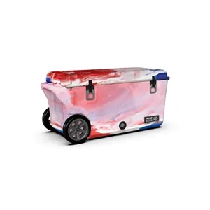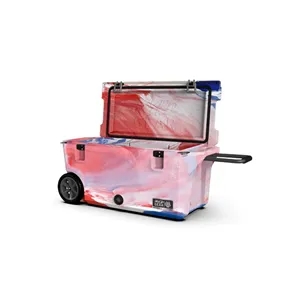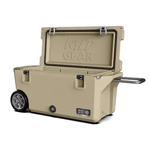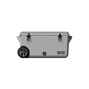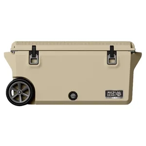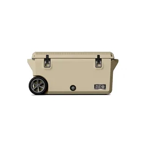 Compact 75 QT ice chest holds 122. cans, featuring 2-inch insulated walls, durable latches, and Rugged Wheels.