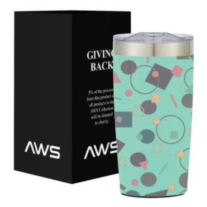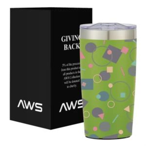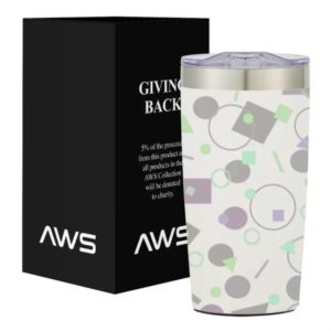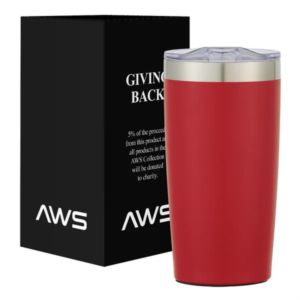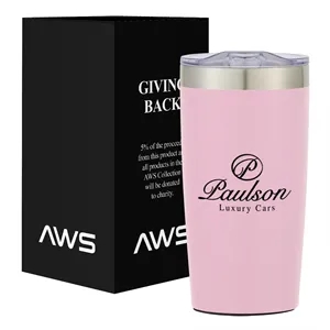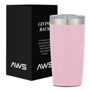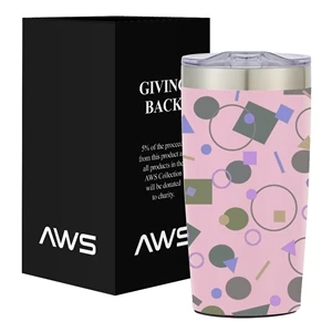 20 ounce stainless steel tumbler with thumb-slide rubber gasketed lid and non-slip bottom.