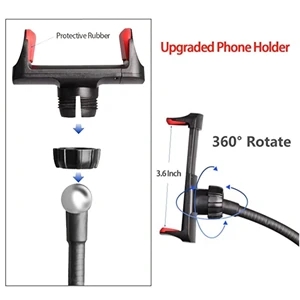 25 9/16" x 13 3/4" x 3 9/16" aluminum and PC plastic LED selfie light and phone holder with flexible 360 degree movement.