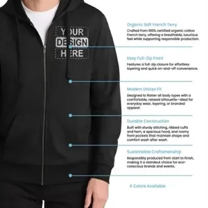 Unisex full-zip hoodie made from 100% certified organic cotton French terry.