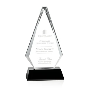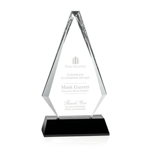 The optical crystal diamond of the Arcadia is precisely beveled with intersecting angles, mounted to a black beveled optical base.