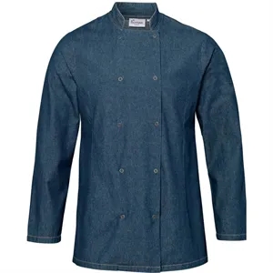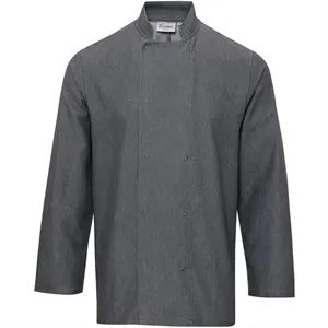 Unisex chef jacket with a collar stand, front fastening, and WRAP certification.