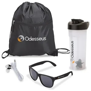 Four-piece gift set with 28 oz. PP shaker cup, UV400 sunglasses, earbud headphones and sport bag with drawstring closure.