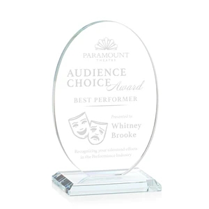 The Austin Award features a 1/2" thick Starfire oval mounted on a glistening clear beveled base.