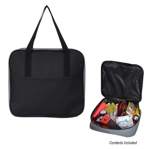 Auto emergency kit with several items for safety and preparedness on the road.