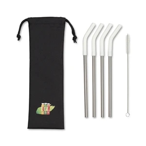 Pack of four 0.25" x 9.5" x 0.25" stainless steel straws with silicone caps and cleaning brush in drawstring storage bag.