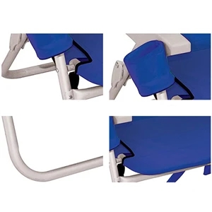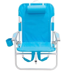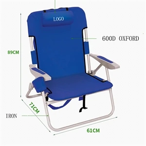 24" x 28" x 35" beach chair with an adjustable design, shoulder straps, a storage pouch, a pillow, and a cup holder.