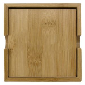 Bamboo coaster set measuring 4" x 4" for protecting tabletops from scratches and spills.