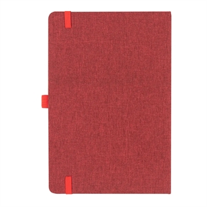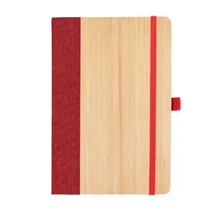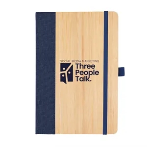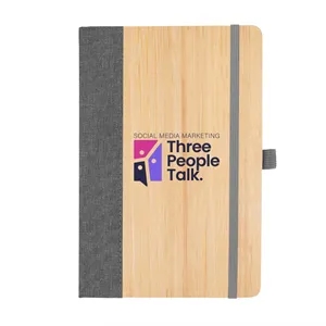 Bamboo and recycled polyester journal with 80 lined pages, bookmark, strap closure and pen loop.