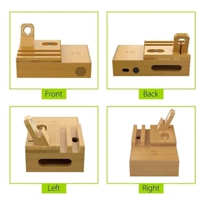 7.88" x 4.72" x 2.17" bamboo wood desk technology organizer with storage compartment, space for four devices and magnetic base.