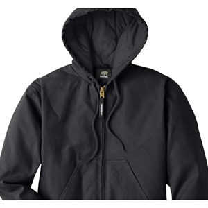 Men's jacket with a hood, quilt-lined taffeta liner, water-repellent finish, zipper, drawstring, pleated action back, and pockets.