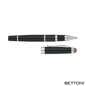 Brass rollerball pen with cap-off design, carbon fiber accents, chrome clip and trims and conductive fiber stylus tip.