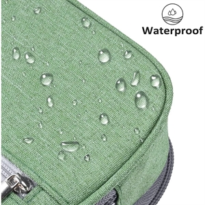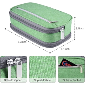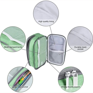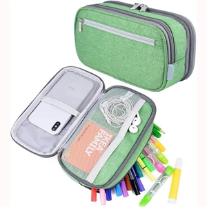 8.4" x 4.4" x 2.4" nylon pencil case with three zippered compartments and netted compartments.